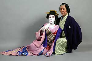 本作品は上演形式としては、通常の演劇形式を基本としていますが、また随所に音楽的要素を伴っており、楽劇的な性格をも備えています。ことに劇中において、享保20年(1735)に江戸中村座で上演された心中浄瑠璃「睦月連理玉椿(※)」を再現することになりますが、人間国宝常磐津一巴太夫師によって復曲された豊後節に基づく「睦月連理玉椿」(道行)の270年ぶりの上演は、本作品のハイライトをなしています。一巴師の豊後浄瑠璃と二人の舞踊家によって演じられる艶やかにして華麗な舞台は、歌舞伎・浄瑠璃ファンにとって垂涎の思いをなす催しとなることでありましょう。