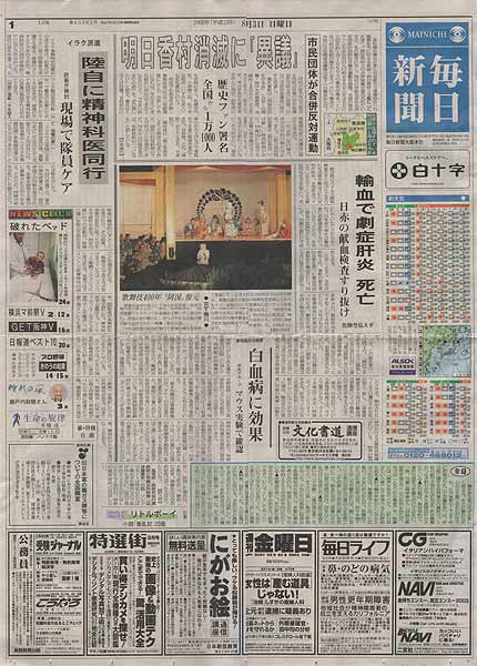 毎日新聞(2003年8月3日朝刊)一面 画像をクリックすると該当記事の詳細をご覧いただけます。