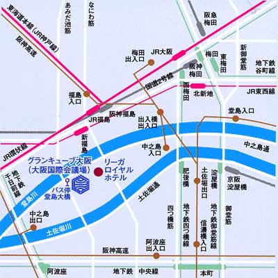 ■JR「大阪駅」駅前バスターミナルから大阪市バス(53系統 船津橋行) または(55系統 鶴町四行)で約15分「堂島大橋」バス停下車すぐ JR大阪環状線「福島駅」 JR東西線「新福島駅」(2番出口) 阪神電鉄「福島駅」 大阪市営地下鉄(中央線・千日前線)「阿波座」(中央線1号出口・千日前線9号出口) 上記各駅よりそれぞれ徒歩約10分 ●シャトルバスが「リーガロイヤルホテル」(会議場東隣)と各ターミナル(JR「大阪駅」中央出口、地下鉄・京阪「淀屋橋駅」西詰)の間で運行しており、ご利用いただけます。