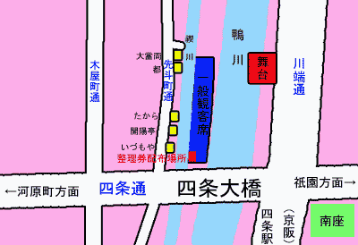 <電車をご利用の場合> ■阪急電車「河原町」下車、四条大橋北約20m 整理券配布場所は一般観客席の入り口付近。